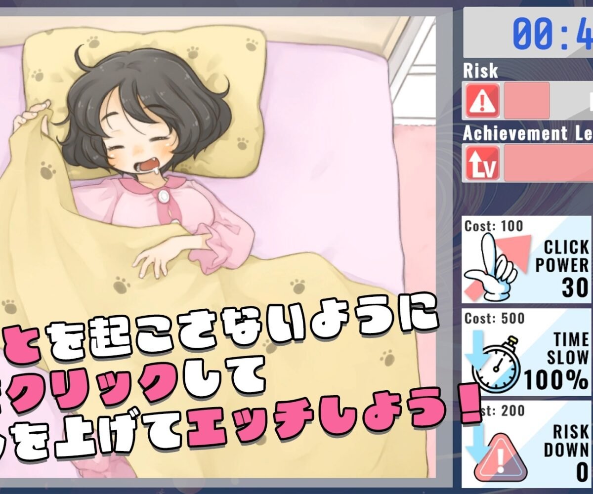 This somnophilia-themed eroge ties its eroticism directly to the clicker game mechanics. Each click raises the risk of waking her up while inching toward the next explicit still image. Specifically, players must balance upgrading click power, extending the 60-second timer, and managing that danger threshold. As a result, the tension between greed and caution makes every tap feel consequential.